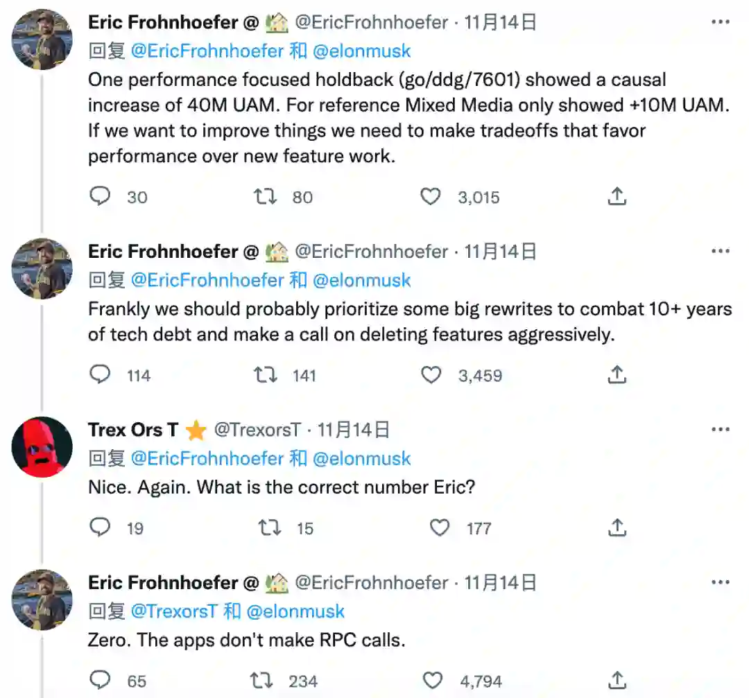 在 Eric Frohnhoefer 看来,如果 Twitter 想要改进一些东西,就需要做出有利于性能而不是新功能工作的权衡。其也表示,“坦率地说,我们可能应该优先考虑一些重大的推翻重写任务,以解决过去 10 多年的技术债务,并且删除一些功能。”