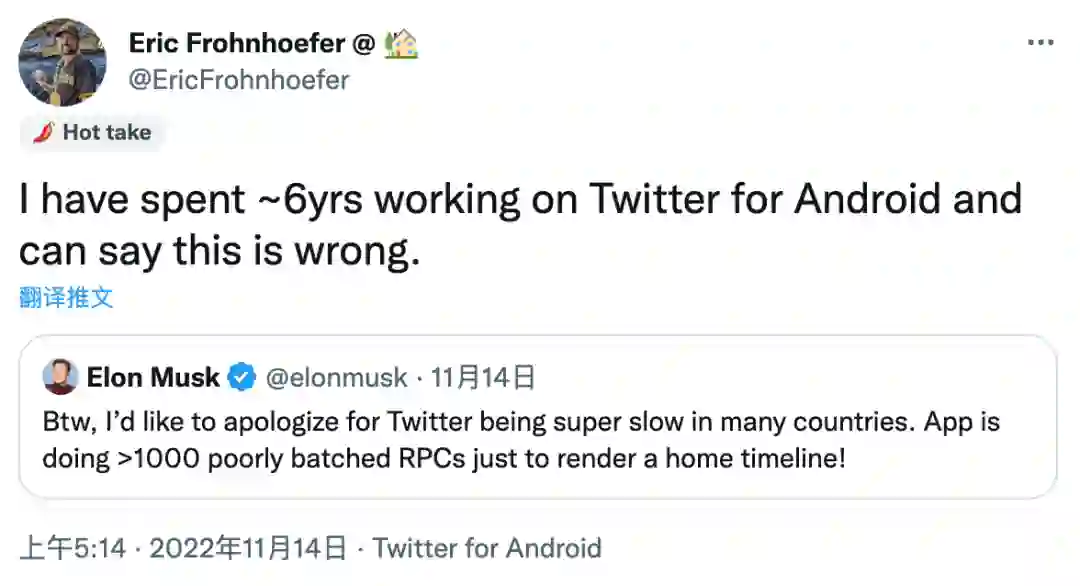 回归马斯克最初提问的本意,或只是为了这款应用在很多国家/地区运行缓慢而道歉,最终却被工程师引向了运行在 Android 系统上的问题,甚至被自家的工程师公开谴责。基于别人的规劝,Eric Frohnhoefer 依然也不愿就此妥协,并说道:也许他(马斯克)应该私下问问题,也可以使用 Slack 或电子邮件。