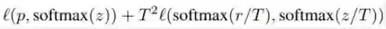 给定输入,假定p是真正的概率分布,z和r分别是学生模型和教师模型最后一个全连接层的输出。之前我们会用交叉熵损失l(p,softmax(z))来度量p和z之间的差异,这里的蒸馏损失同样用交叉熵。所以,使用知识蒸馏方法总的损失函数是