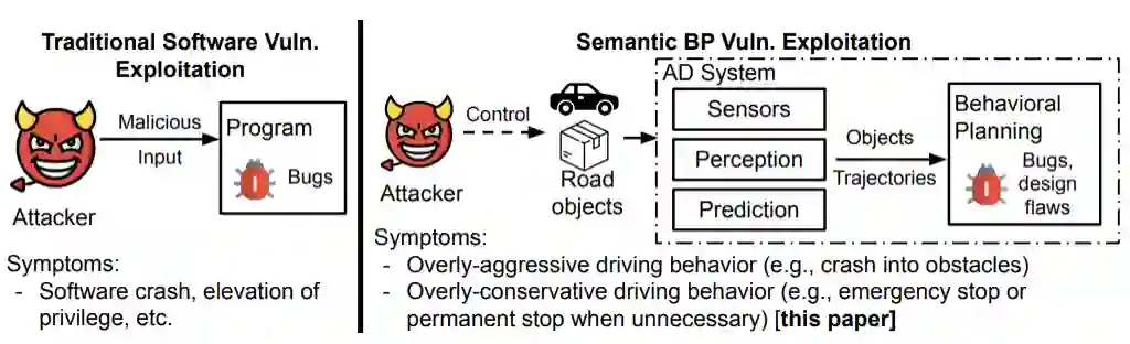 我们还定义了自动驾驶规划中的语义漏洞,这与一般漏洞的症状不同。自动驾驶规划中的语义漏洞是那些可以被利用并因此导致意外驾驶决策的漏洞。意外的决定可能是过于激进的决定(例如撞到障碍物)或过于保守的决定(例如紧急停止或不必要的永久停止)。我们将重点放在后面的一个,因为我们认为这在当今的系统中更为普遍。我们也将它们称为语义 DoS 漏洞。