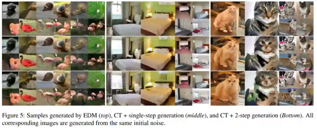 图 5 提供了 EDM (Karras et al., 2022) 样本(顶部)、single-step CT 样本(中)和 two-step CT 样本(底部)。