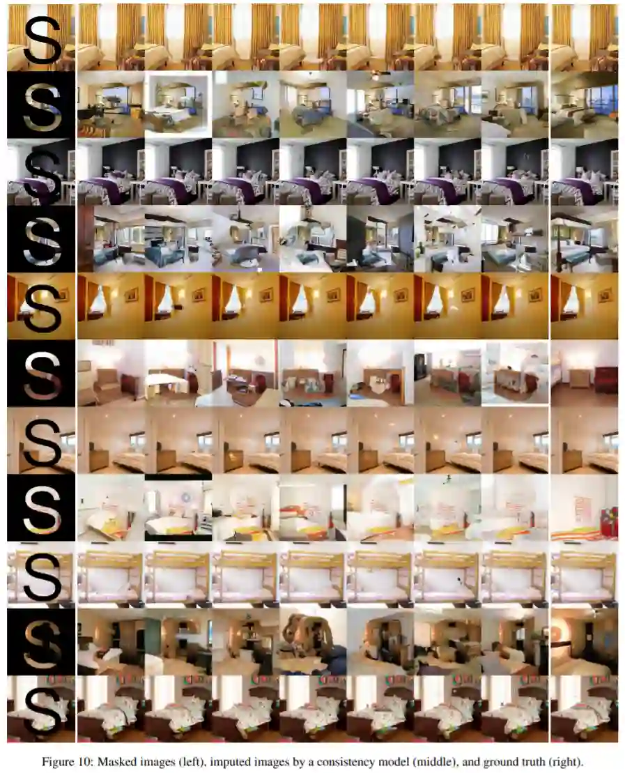 Consistency Model 图像修复功能:左边是经过掩码的图像,中间是 Consistency Model 修复的图像,最右边是参考图像: