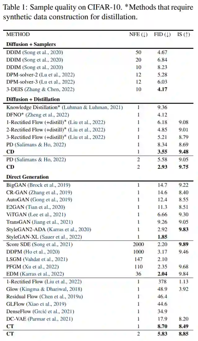 表 1 和表 2 表明 CT( consistency training ) 在 CIFAR-10 上的表现优于所有 single-step、非对抗性生成模型,即 VAE 和归一化流。此外,CT 在不依赖蒸馏的情况下获得与 PD ( progressive distillation )相当的质量,用于 single-step 生成。