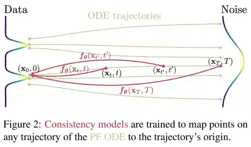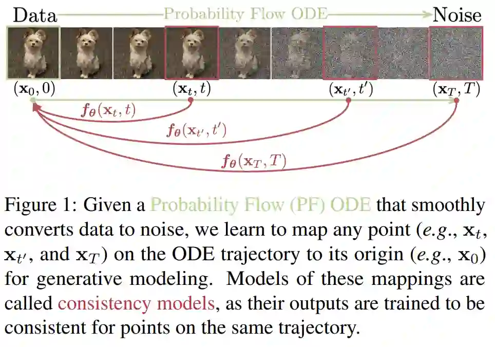 首先 Consistency Models 建立在连续时间扩散模型中的概率流 (PF) 常微分方程 (ODE) 之上。如下图 1 所示,给定一个将数据平滑地转换为噪声的 PF ODE,Consistency Models 学会在任何时间步(time step)将任意点映射成轨迹的初始点以进行生成式建模。Consistency Models 一个显著的特性是自洽性(self-consistency):同一轨迹上的点会映射到相同的初始点。这也是模型被命名为 Consistency Models(一致性模型)的原因。