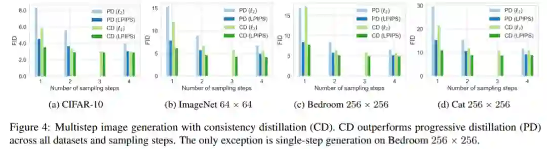 研究团队通过实验证明 Consistency Models 在 one-step 和 few-step 生成中优于现有的扩散模型蒸馏方法。例如,在 one-step 生成方面,Consistency Models 在 CIFAR-10 上实现了新的 SOTA FID 3.55,在 ImageNet 64 x 64 上为 6.20。当作为独立生成模型进行训练时,Consistency Models 在 CIFAR-10、ImageNet 64 x 64 和 LSUN 256 x 256 等标准基准上的表现也优于 single-step、非对抗生成模型。