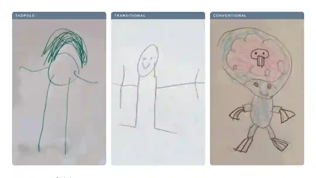 举个例子,孩子画的「火柴人」没有躯干,胳膊和腿直接连在头上。