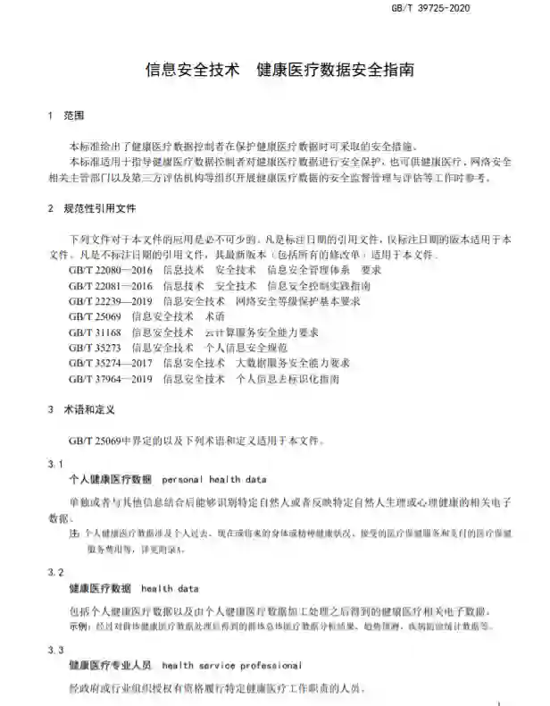 《信息安全技术健康医疗数据安全指南》国家标准,本标准给出了健康医疗数据控制者在保护健康医疗数据时可采取的安全措施。本标准适用于指导健康医疗数据控制者对健康医疗数据进行安全保护,也可供健康医疗、网络安全 相关主管部门以及第三方评估机构等组织开展健康医疗数据的安全监督管理与评估等工作时参考。