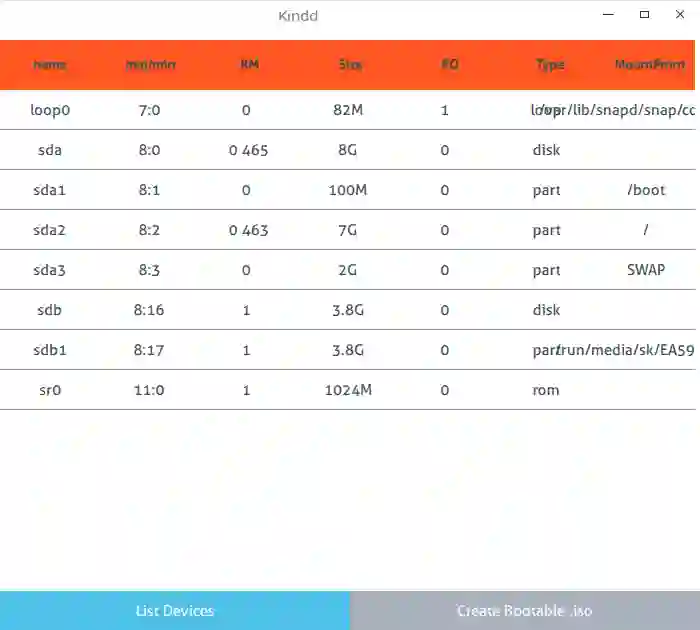 正如你所能看到的,Kindd 界面是非常简单的和明白易懂的。这里仅有两部分,即设备列表,它显示你的系统上的可用的设备(hdd 和 Usb),并创建可启动的 .iso 。默认情况下,你将在“创建可启动 .iso”部分。