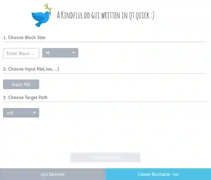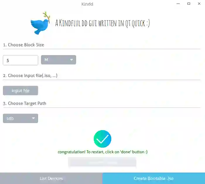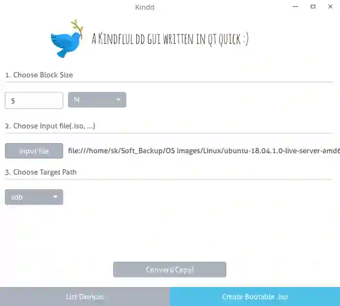 前不久,我们已经学习如何在类 Unix 系统中 使用 dd 命令创建可启动的 ISO。请记住,dd 命令是最具危险性和破坏性的命令之一。如果你不确定你实际在做什么,你可能会在几分钟内意外地擦除你的硬盘数据。dd 命令仅仅从 if 参数获取数据,并写入数据到 of 参数。它将不关心它正在覆盖什么,它也不关心是否在磁道上有一个分区表,或一个启动扇区,或者一个家文件夹,或者任何重要的东西。它将简单地做它被告诉去做的事。如果你是初学者,一般地尝试避免使用 dd命令来做实验。幸好,这有一个支持 dd 命令的简单的 GUI 实用程序。向 “Kindd” 问好,一个属于 dd 命令的图形化前端。它是自由开源的、用 Qt Quick 所写的工具。总的来说,这个工具对那些对命令行不适应的初学者是非常有用的。