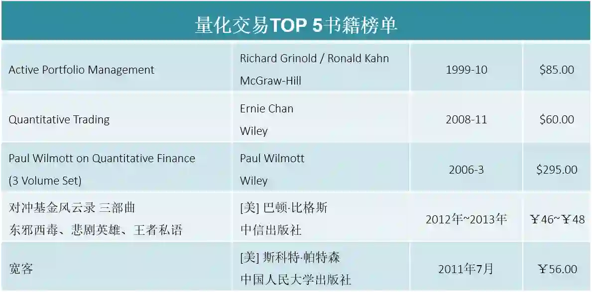 书籍。因为量化投资在国内起步很晚,书籍基本都是出自美国作家之手,这里列举TOP 5书籍榜单,此榜单可以认为是量化交易的金融基础知识,至于软件程序方面,都是机器学习和大数据相关的通用技能,故不再列举。