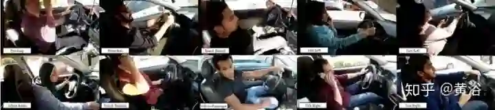 下图一个身体姿势(posture)识别驾驶员分心症状的系统。其症状类包括:喝酒,调整收音机,正确姿势驾驶,摆弄头发或化妆品,面向后面,与乘客交谈,用左手打手机通话,用右手打手机通话,用左手发短信, 用右手发短信。