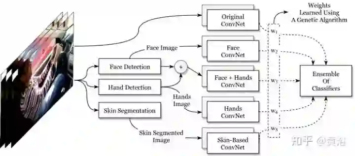 系统的算法框图如图:包括面部检测器、手部检测器和皮肤区域分割。对于每个输出图像(即皮肤,面部,手),训练AlexNet和InceptionV3网络(5个AlexNet和5个InceptionV3),最后识别是一个加权组合输出。