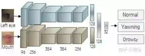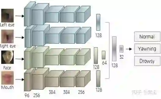 其基于脸部、双目和嘴巴三个区域的检测网络结构如下: