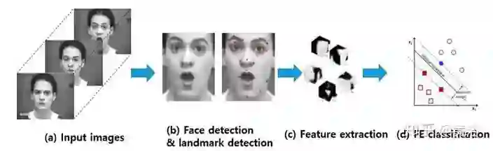 如图是一个基于深度学习模型的人脸表情识别系统:输入图像检测面部和特征,从面部成分提取时空特征,使用预训练的分类器(图像取自CK+数据集(d))确定表情。
