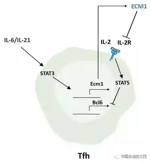 该研究发现ECM1缺失小鼠表现出TFH细胞分化、生发中心形成和抗原特异性抗体分泌的显著降低;相反,给野生型小鼠体内注入过量的重组ECM1蛋白会增强TFH细胞分化和生发中心反应;给流感感染小鼠注射重组ECM1蛋白会增强TFH细胞分化,促进流感特异性中和性抗体的分泌;进一步机制研究发现ECM1通过阻断IL-2-STAT5信号通路来抑制Blimp1的表达,同时促进Bcl6的表达,从而调控TFH细胞的分化;此项成果揭示出ECM1蛋白可以正性调控TFH细胞的分化和抗体生成,有重要的科学意义和潜在的应用价值。