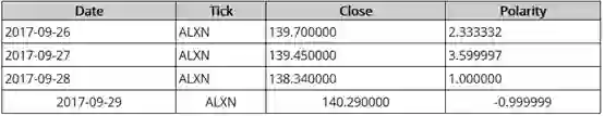 最后,数据被TICK和日期分组,总结了TICK有多个消息的日期的极性分数。
