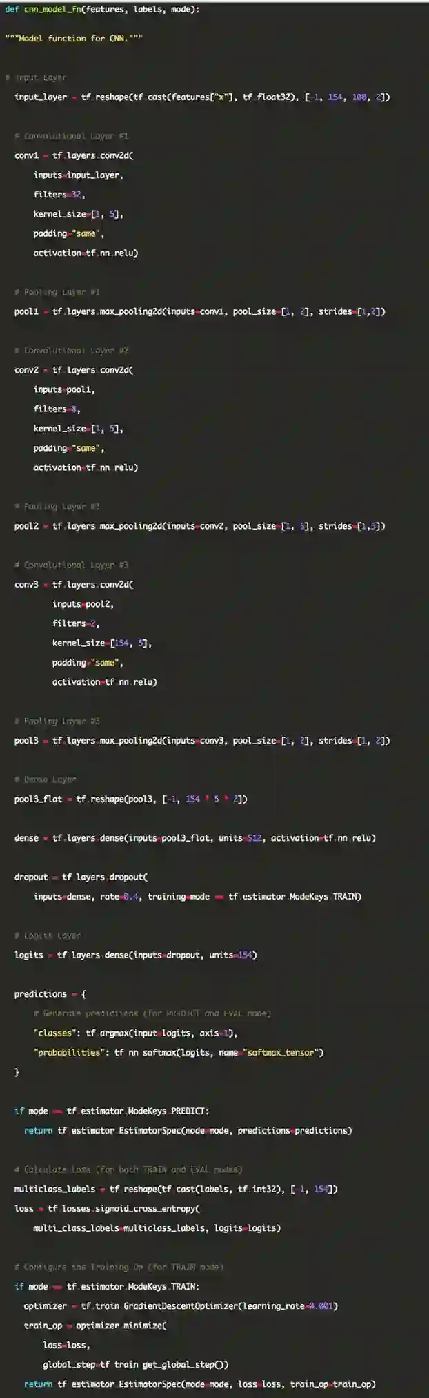 已经从TensorFlow教程的例子开始构建CNN,然后使之适用于我们的任务。前两层卷积层和pooling层的高度都等于1,因此它们对单个股票进行卷积和汇集,最后一层的高度等于154,以了解股票之间的相关性。最后是密集层,最后一个长度为154,每个股票对应一个。网络的规模可以用笔记本电脑在数据集上进行几个小时的训练。部分代码如下: