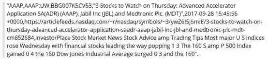 为了检索新闻,我使用intrinio的API。对于每个tick,我从“https://api.intrinio.com/news.csv?ticker={tick}”下载相关的新闻数据。数据以csv格式显示,如下图: