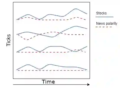 通过合并股票和新闻数据,我们得到如下的数据集,从2016-01-04到2017-09-30的所有日期划分为154个刻度,并且股票的收盘价和极性值分别为: