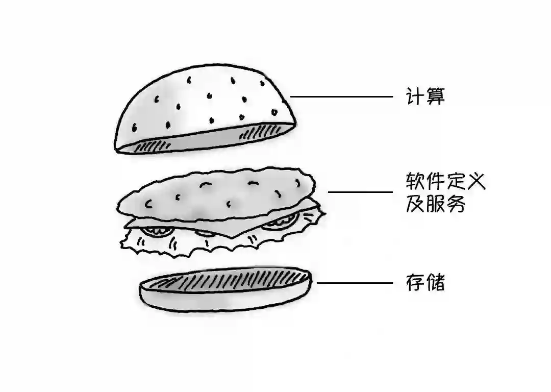 在汉堡中,上下两层面包就是计算与存储,中间的夹心就是软件定义和各种服务。这三者作为一个整体紧密协作,为企业和运维人员带来了很多好处——