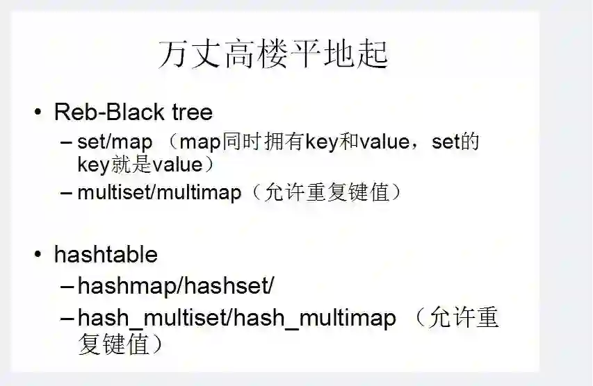 所以,综上,说白了,什么样的结构决定其什么样的性质,因为set/map/multiset/multimap都是基于RB-tree之上,所以有自动排序功能,而hash_set/hash_map/hash_multiset/hash_multimap都是基于hashtable之上,所以不含有自动排序功能,至于加个前缀multi_无非就是允许键值重复而已。如下图所示: