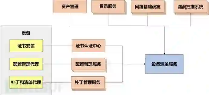 这个服务核心通过漏洞扫描系统依照设备清单不断获取设备的漏洞补丁情况以及其它设备配置基线情况。