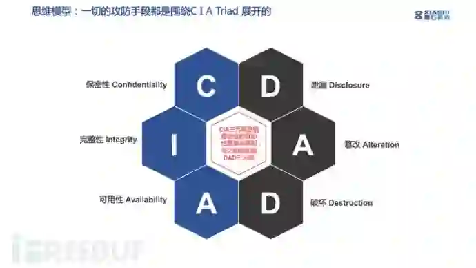 我们先来看一个比较简单的思维模型,CIA Triad原则就是一切的攻防手段都是围绕着保密性(C)、完整性(I)、可用性(A)三原则展开的。