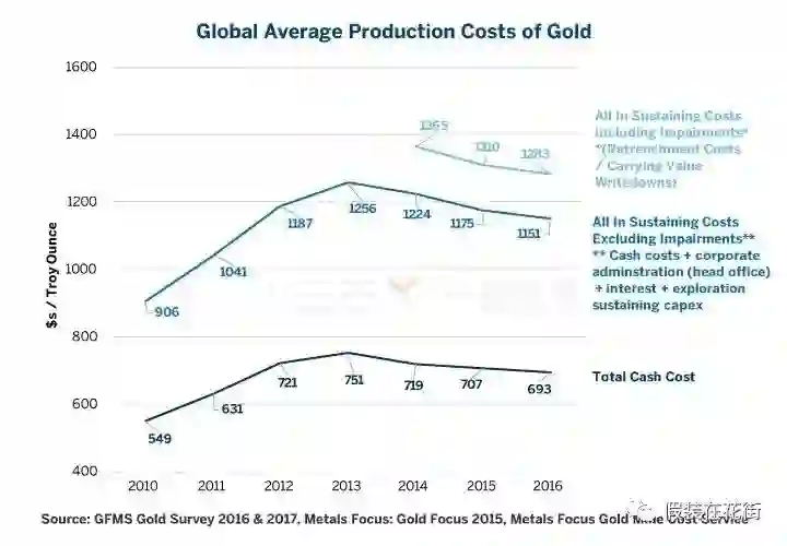 而对于像铜,金和银这样的金属来说,有两个数字需要注意:现金成本和维持全部运营、投资需要的成本。现金成本是指生产者维持当前生产的价格。例如,金矿经营者的现金成本平均在每盎司700美元左右,而全运营成本约为每盎司1250美元: