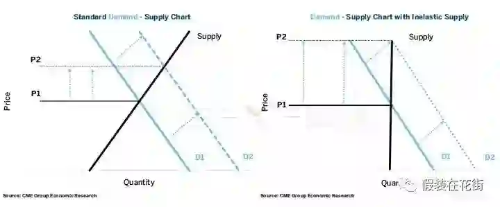 而右图则是一个供给-价格弹性接近0的商品(粗黑线不随价格变化而变化)当需求由D1变到D2时(蓝线),我们看到价格由P1升到了P2的幅度要比左图大的多,这很直观的展示了为何供给无弹性的商品价格波动大。