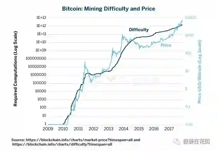 上图中,深蓝线是1个比特币的算量需求,浅蓝线是比特币价格,两者都是对数坐标。