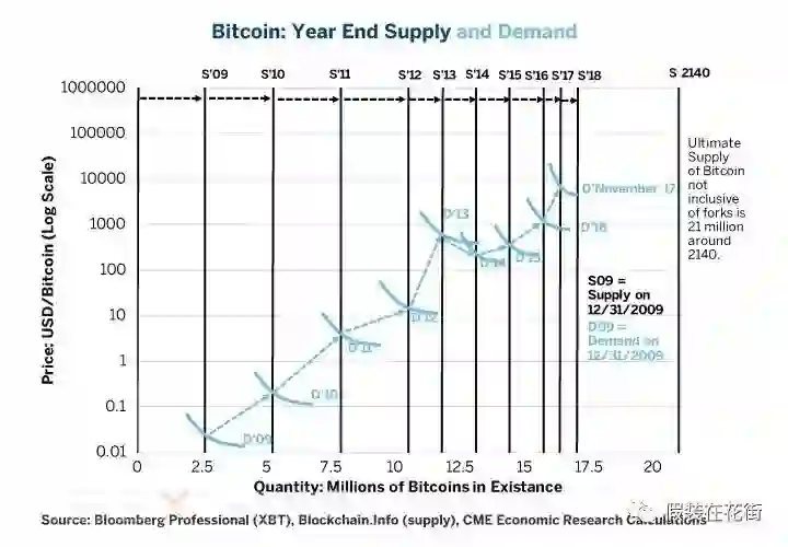 比特币的涨幅如此惊人,以致只能在对数尺度上才能看清楚。在比特币出现的前四年,供应量每年大约增加250万个币。即便如此,随着用户群体的成长,价格也在上涨。如下图所示,是CME估算的比特币供给-需求图可以看到最近的供给增速明显放缓,但需求还在增加: