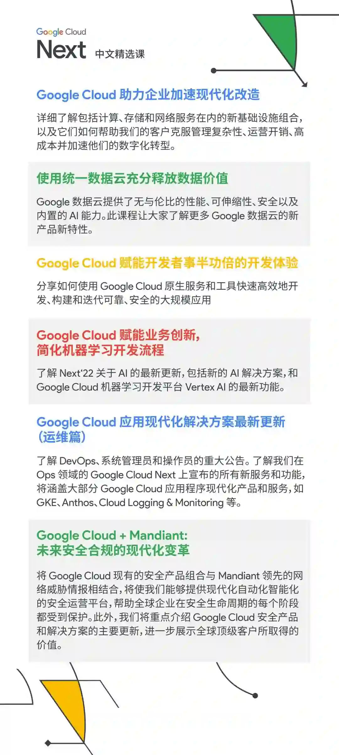 自今日,迎未来!今年的 Next 大会上 Google Cloud 推出多达 123 项新发布,覆盖前沿技术、产品战略与应用实践多个领域。想快速深入了解这些 Google Cloud 最新产品与工具,重塑开发体验,赋能出海创新?Next '22 中文精选课来啦!11 月 8 日,Google Cloud 将精选大会在应用现代化、云原生、数据云、AI 和机器学习、DevOps 及安全合规等领域的前沿技术发布,带您全面解读!