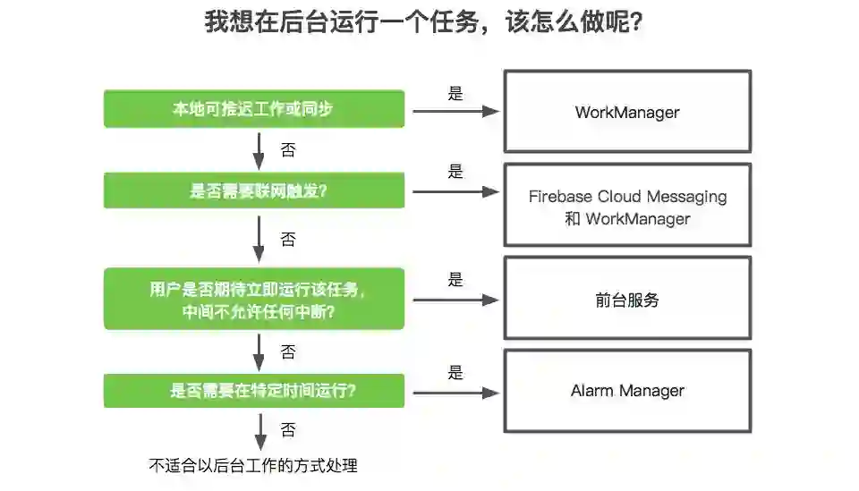 开发者在选择后台执行工具前,首先要对应用需求和限制场景有个清晰的了解,我们建议您参照以下流程图,为应用制定最佳的后台决策: