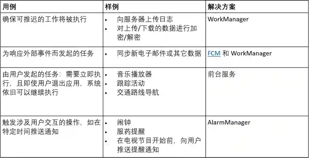 作为 Android 推荐的后台管理工具,WorkManger 考虑了系统内的所有后台执行限制。如果您需要确保推迟的任务一定会被执行,请务必调用 WorkManager。该 API 允许您调度任务 (单次执行或循环执行) ,组合任务和构成任务链。您还可以添加任务执行的约束条件,例如:当设备空闲或充电时才可以触发,或者当内容提供程序发生变更时才可以运行。