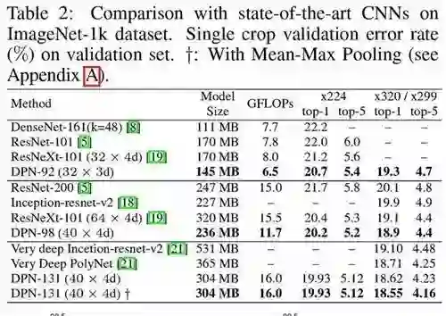 作者分别在“图像分类”,“物体检测”和“物体分割”三大任务上对 DPN 进行了验证。在 ImageNet 1000 类分类任务中的性能如表 2 所示: