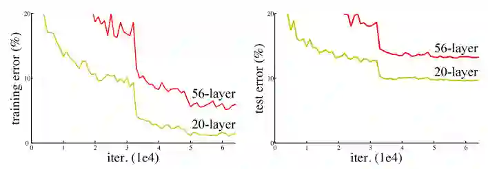 但是,如果只是简单地将层堆叠在一起,增加网络的深度并不会起太大作用。这是由于难搞的梯度消失(vanishing gradient)问题,深层的网络很难训练。因为梯度反向传播到前一层,重复相乘可能使梯度无穷小。结果就是,随着网络的层数更深,其性能趋于饱和,甚至开始迅速下降。