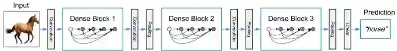 也是在 2016 年,康奈尔大学的 Gao Huang 和清华大学的 Zhuang Liu 等人在论文 Densely Connected Convolutional Networks [9]中,提出一种称为 DenseNet 的新架构。不同于 ResNet 将输出与输入相加,形成一个残差结构,DenseNet 将输出与输入相并联,实现每一层都能直接得到之前所有层的输出。