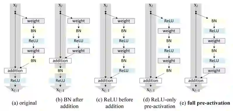 按照这种直觉,前述《用于图像识别的深度残差学习》[2]的作者改进了残差块,并提出一个残差预激活变体[7],其中梯度可以畅通无阻地通过 shortcut 连接到任何其他先前的层。实际上,这一研究表明,使用原始的残差块,训练一个 1202 层的 ResNet 比 110 层的 ResNet 性能更差。