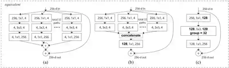 这个可能看起来很眼熟,因为它与 GoogLeNet [4]的 Inception 模块非常类似。它们都遵循“拆分-转换-合并“的范式,区别只在于 ResNeXt 这个变体中,不同路径的输出通过将相加在一起来合并,而在 GoogLeNet [4]中不同路径的输出是深度连结的。另一个区别是,GoogLeNet [4]中,每个路径彼此不同(1x1, 3x3 和 5x5 卷积),而在 ResNeXt 架构中,所有路径共享相同的拓扑。