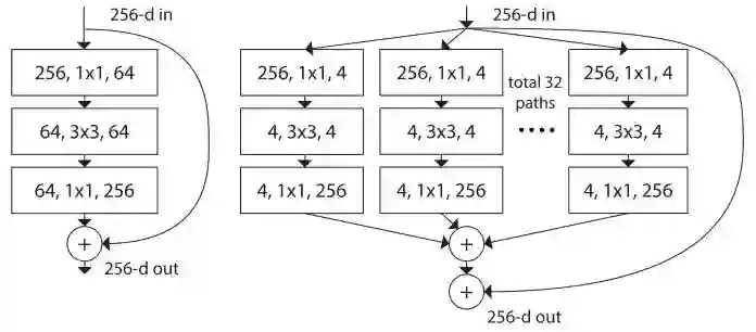 左:[2]的构建块;右:ResNeXt 的一个构建块,基数=32