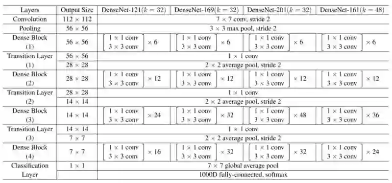 遵循这个范式,我们知道第 l 层将具有 k *(l-1)+ k_0 个输入特征映射,其中 k_0 是输入图像中的通道数。作者使用一个名为增长率(k)的超参数来防止网络的生长过宽,以及使用一个 1x1 的卷积瓶颈层来减少昂贵的 3x3 卷积之前的特征映射数量。整体结构如下表所示: