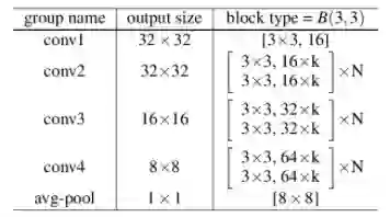 WRN 结构如上,作者表示,小的滤波器更加高效,所以不准备使用超过 3x3 的卷积核,提出了宽度放大倍数 k 和卷积层数 l。