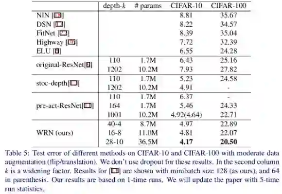 WRN 40-4 与 ResNet-1001 结果相似,参数数量相似,但是前者训练快 8 倍。作者总结认为: