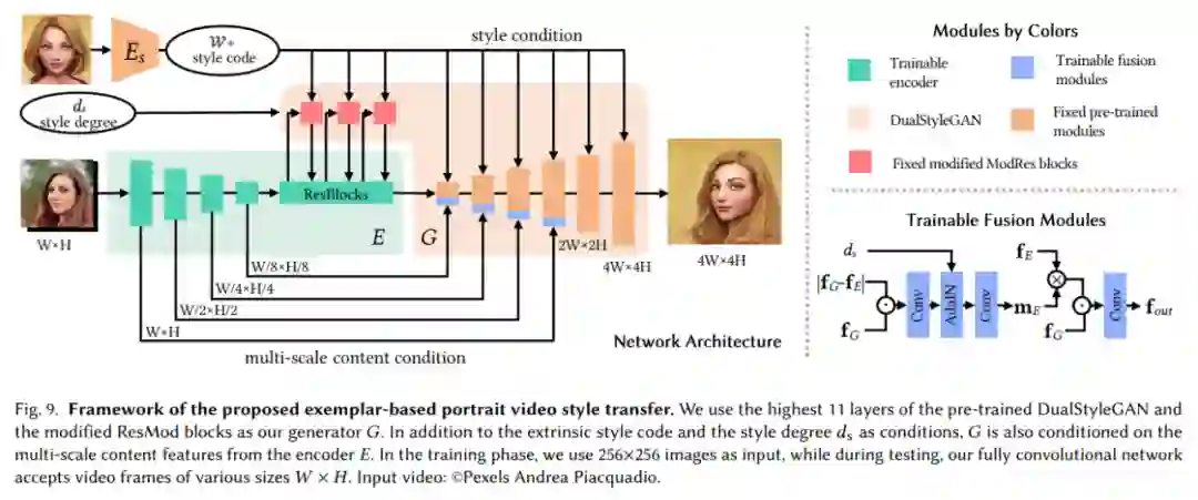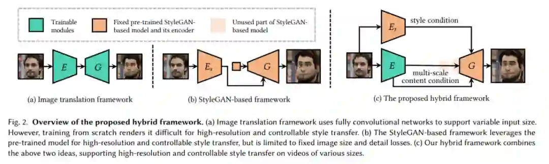 他们采用[Pinkney and Adler 2020] 的 StyleGAN 架构进行高分辨率的视频风格转换,但通过删除固定大小的输入特征和低分辨率层来调整 StyleGAN,构建了一个全新的全卷积编码器 - 生成器架构,类似于图像转换框架中的架构,支持不同的视频大小。