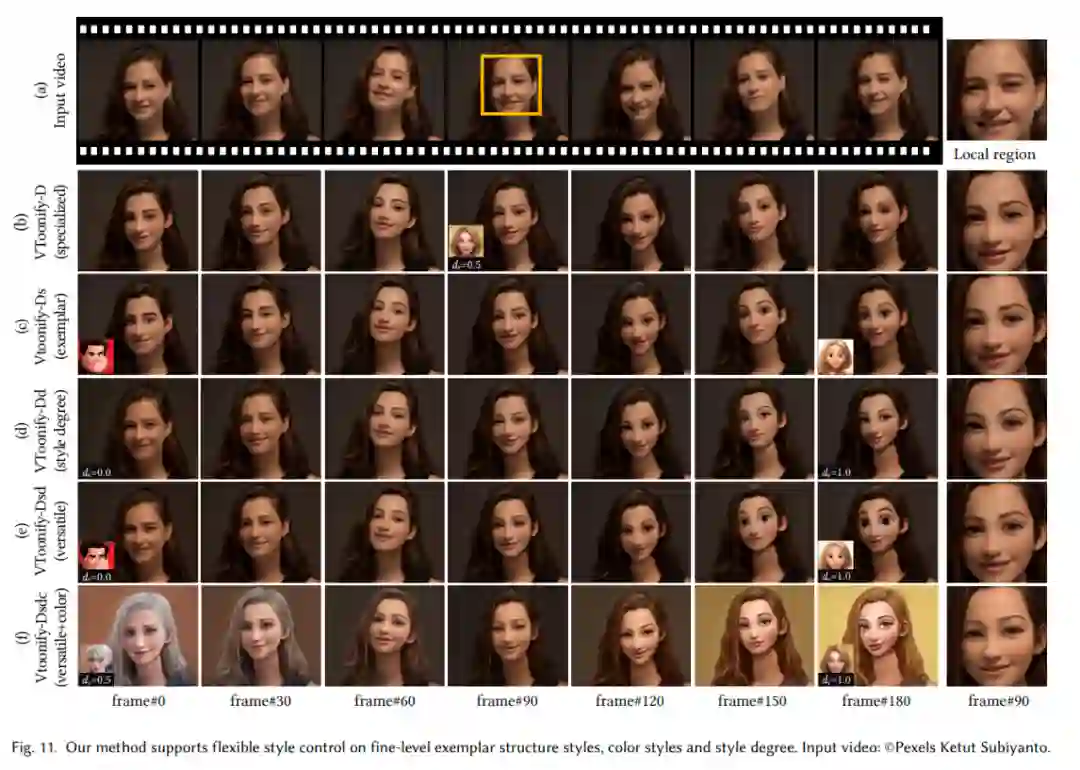 研究者通过采用 DualStyleGAN 的风格控制模块 [Yang et al. 2022] 来调整编码器的特征,并精心设计数据生成和训练目标。VToonify 继承了 DualStyleGAN 灵活的风格控制和风格程度的调整,并进一步将这些功能扩展到视频(如图 1 右上角所示)