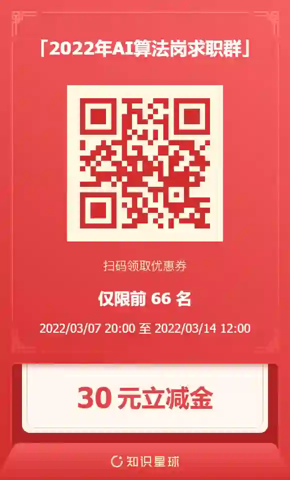 CVer 在此赠送 66 张 AI算法岗求职群(知识星球)30元优惠券!今年最大的优惠力度!今年、明年和未来几年要找工作的同学们可以抢起来了~注:2022年是针对2022届、2023届,但星球一直不会变(24届及以后都会在里面),里面的内容永存!