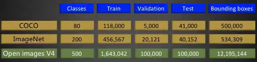Open Image V4 与 MS COCO及ImageNet 检测数据对比情况