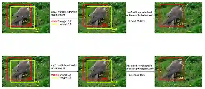 合并从所有模型得到的预测框并使用NMS,此外,除此之外,研究人员采用不同模型的分数叠加的方式代替只保留最高分模型,在这个步骤中IOU阈值为0.5。