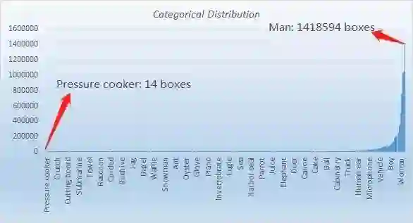 数据分布不均衡:最少的类别框选只有14个,而最多的类别框选超过了140w,数据分布严重不均衡。