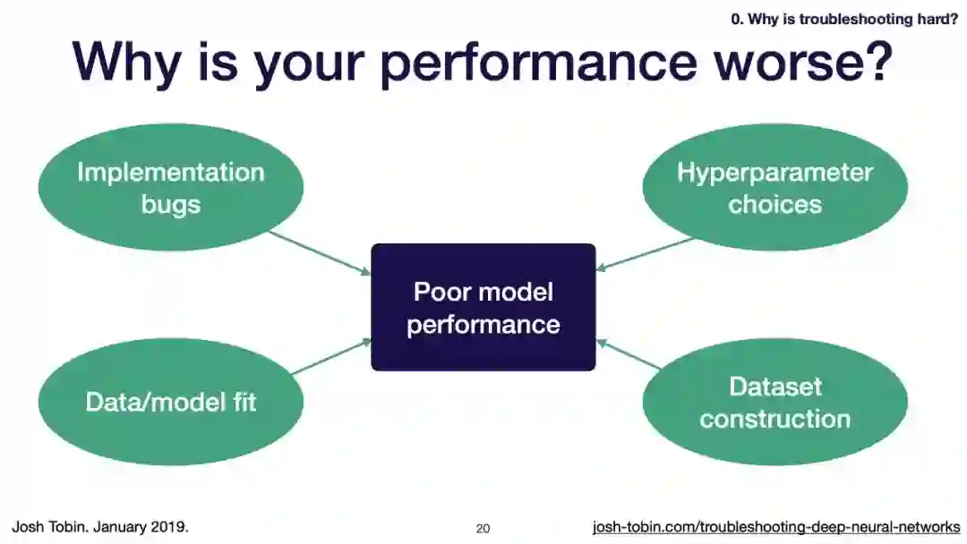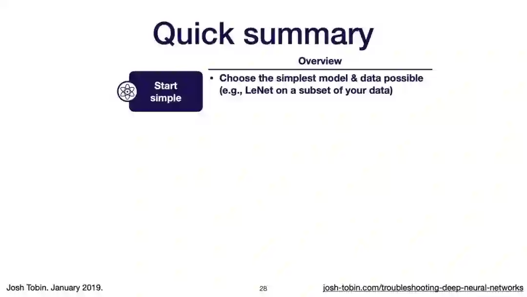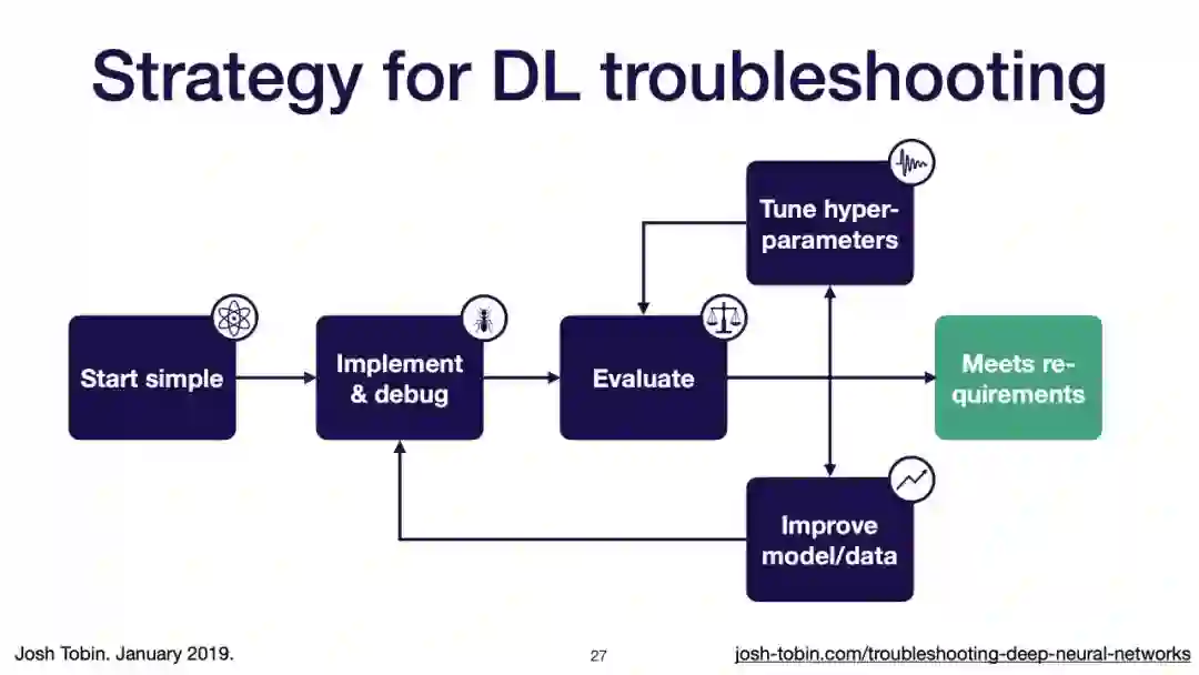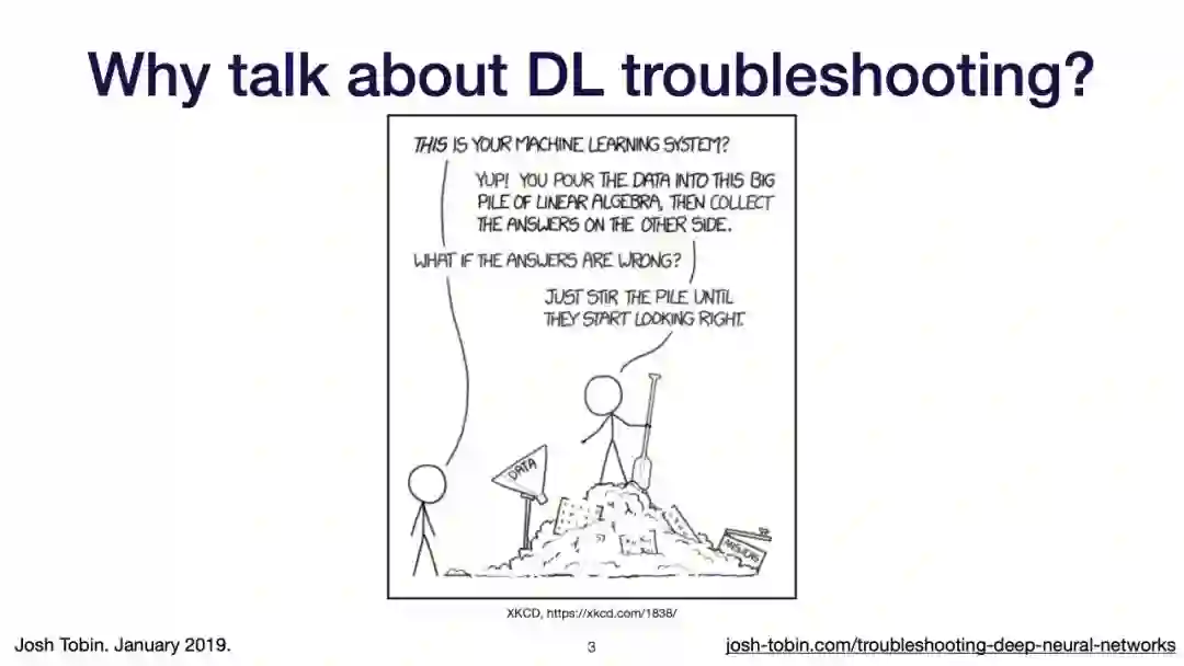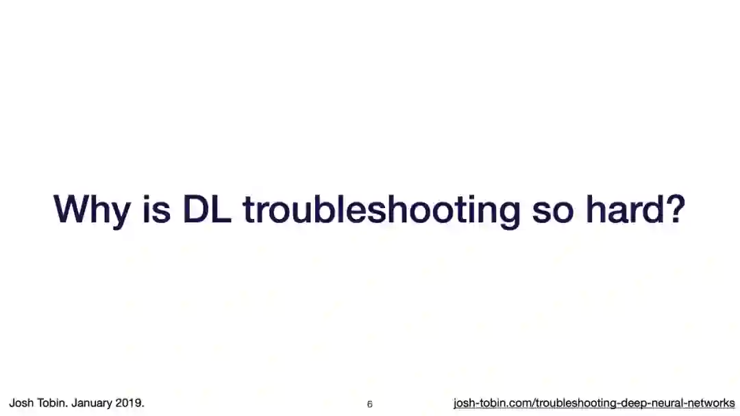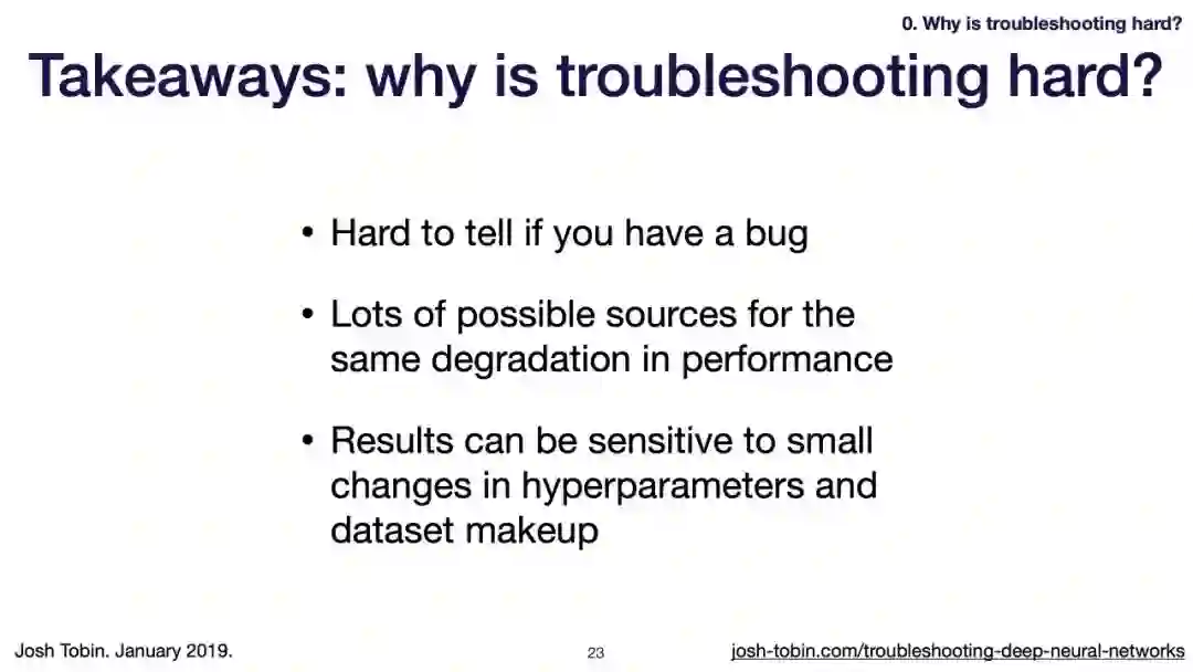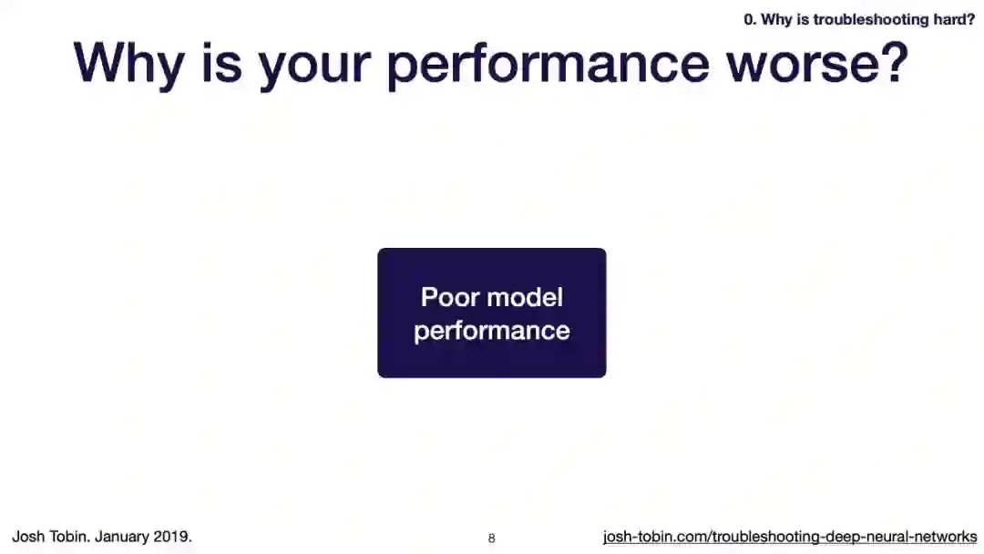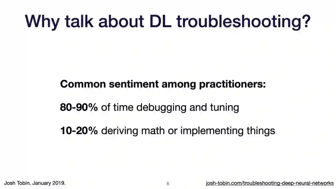 【导读】模型不work其实是很正常的事情,模型work才是不正常的事情[手动狗头]。不过,对于大神来说,这都不是事儿。来自OpenAI的大神Josh Tobin,有感于我等调模型幸苦,写了141页PPT,取名《Troubleshooting Deep Neural Networks - A Field Guide to Fixing Your Model》,旨在帮助萌新调整自己的深度神经网络。
